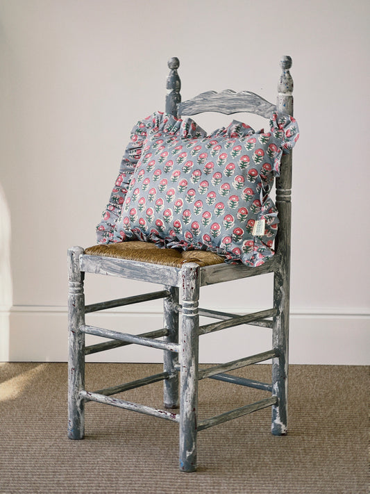COJÍN VOLANTES BLOCK PRINT FLORAL GRIS ROSA