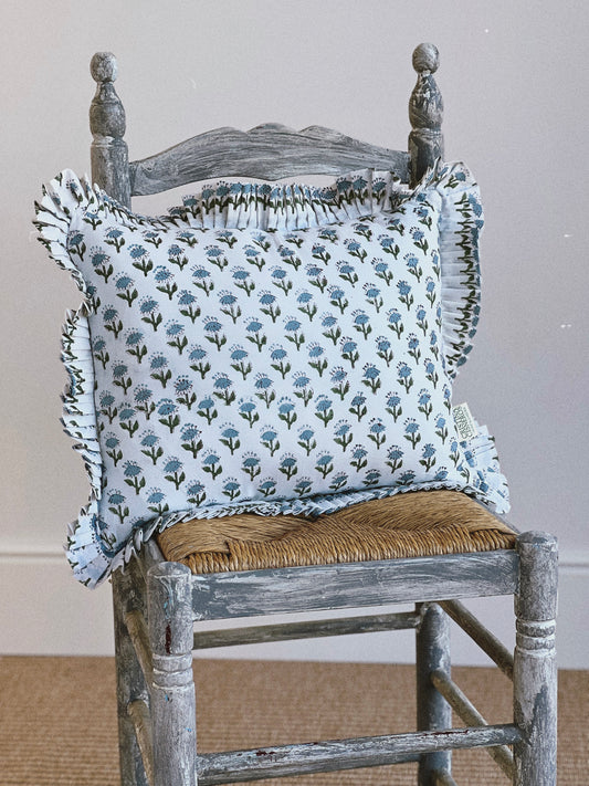 COJÍN VOLANTES BLOCK PRINT FLORAL AZUL VERDE