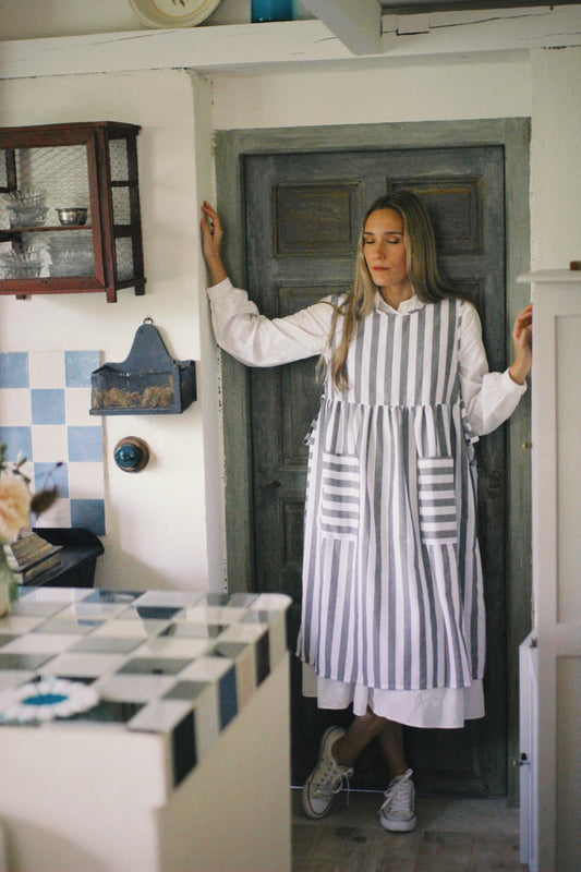 Sold outGRAY STRIPED LINEN APRON WITH BOW