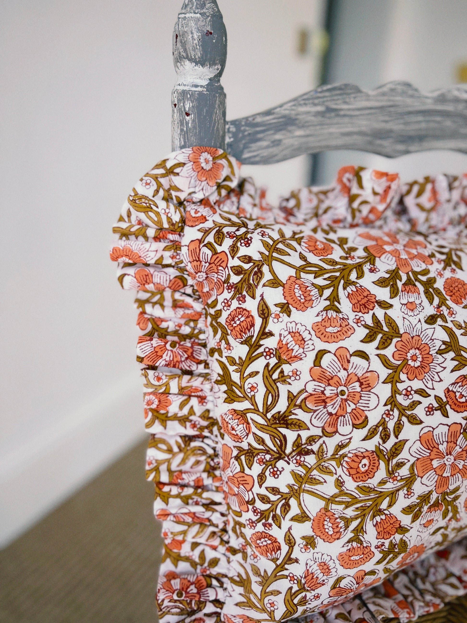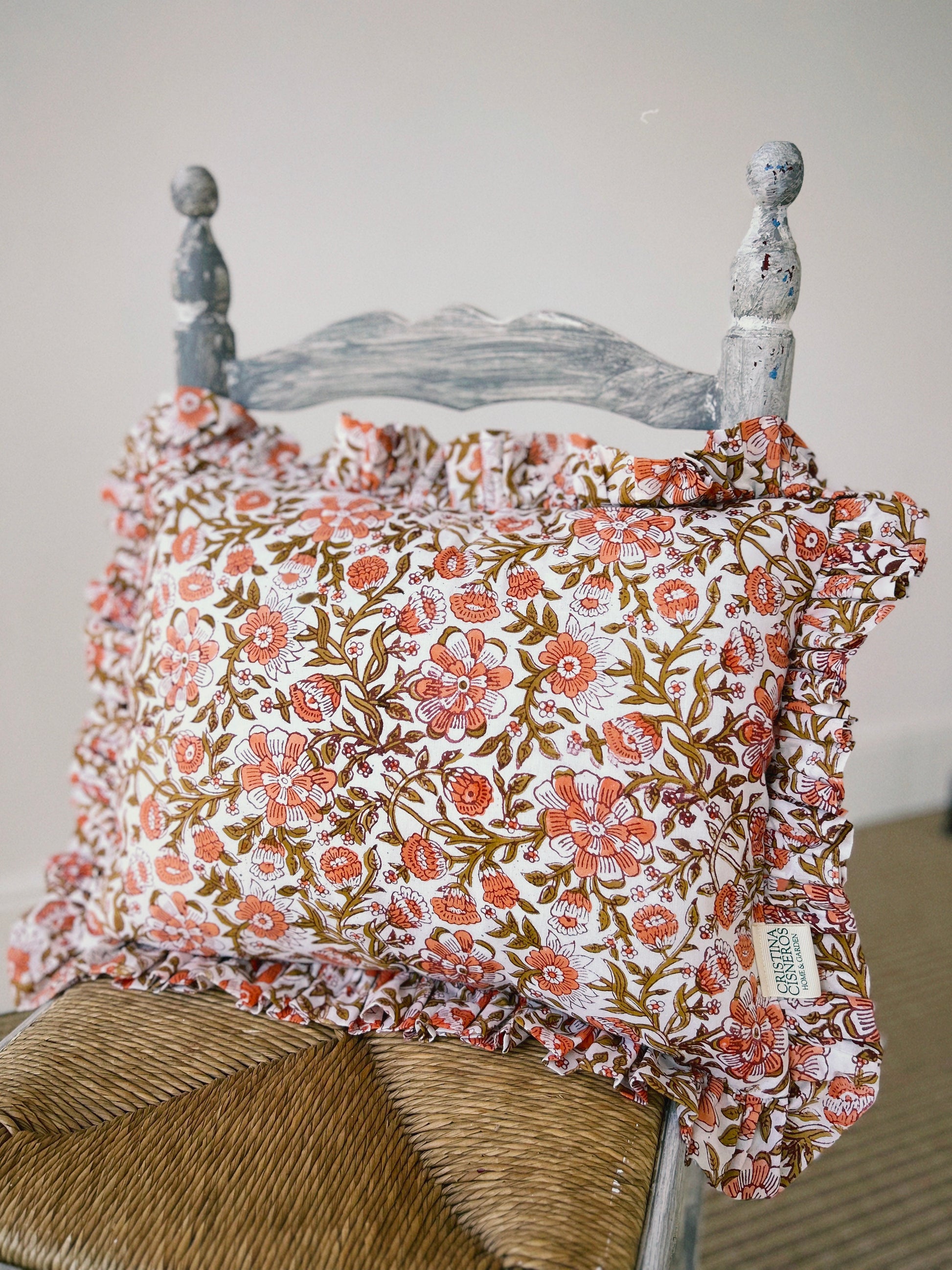 CORAL BRONZE FLORAL BLOCK PRINT RUFFLE CUSHION