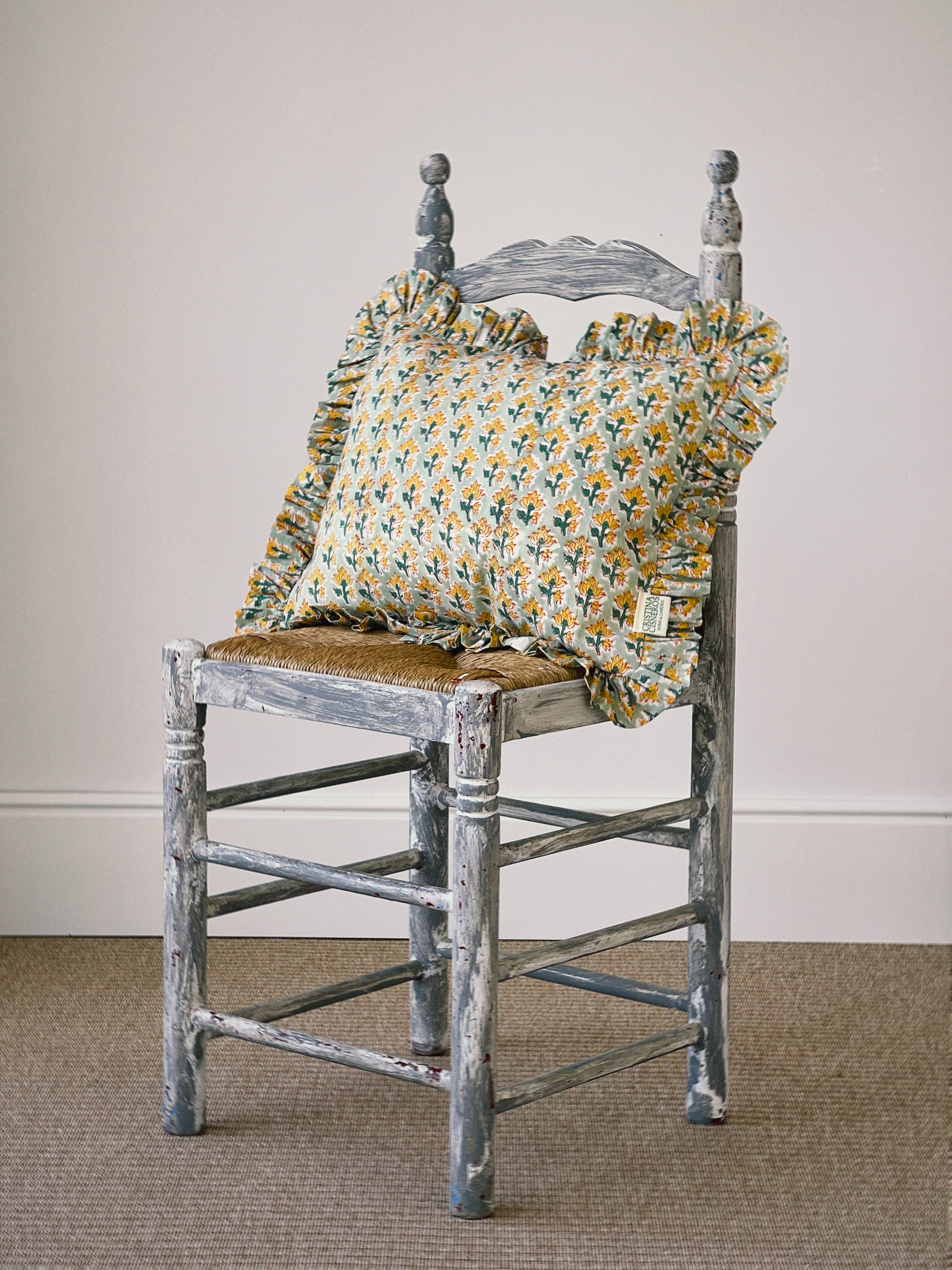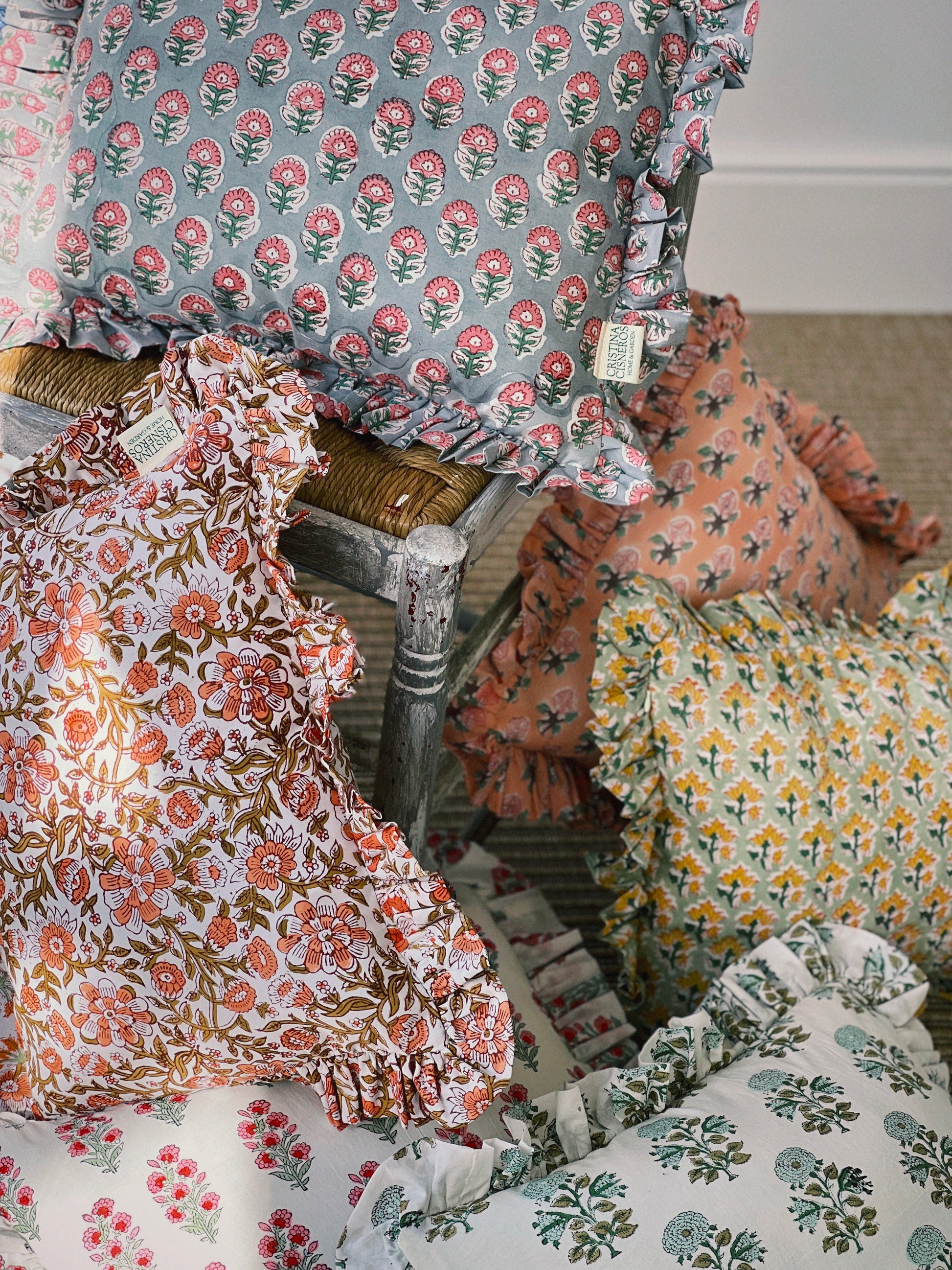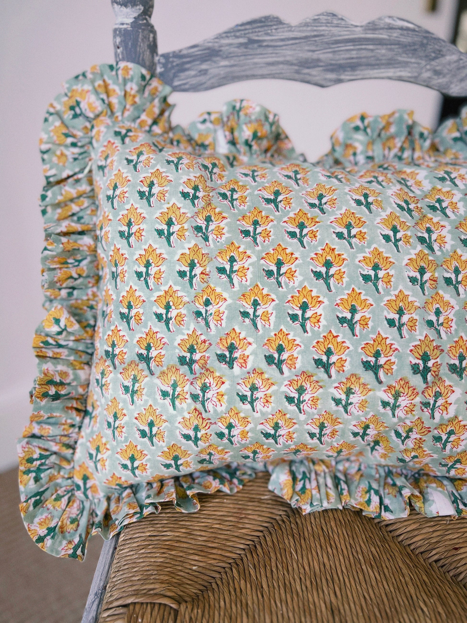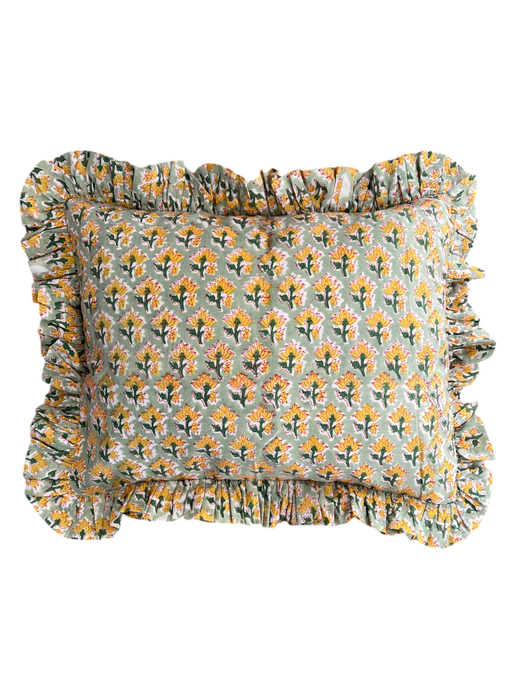 CUSHION RUFFLES BLOCK PRINT FLORAL GREEN YELLOW