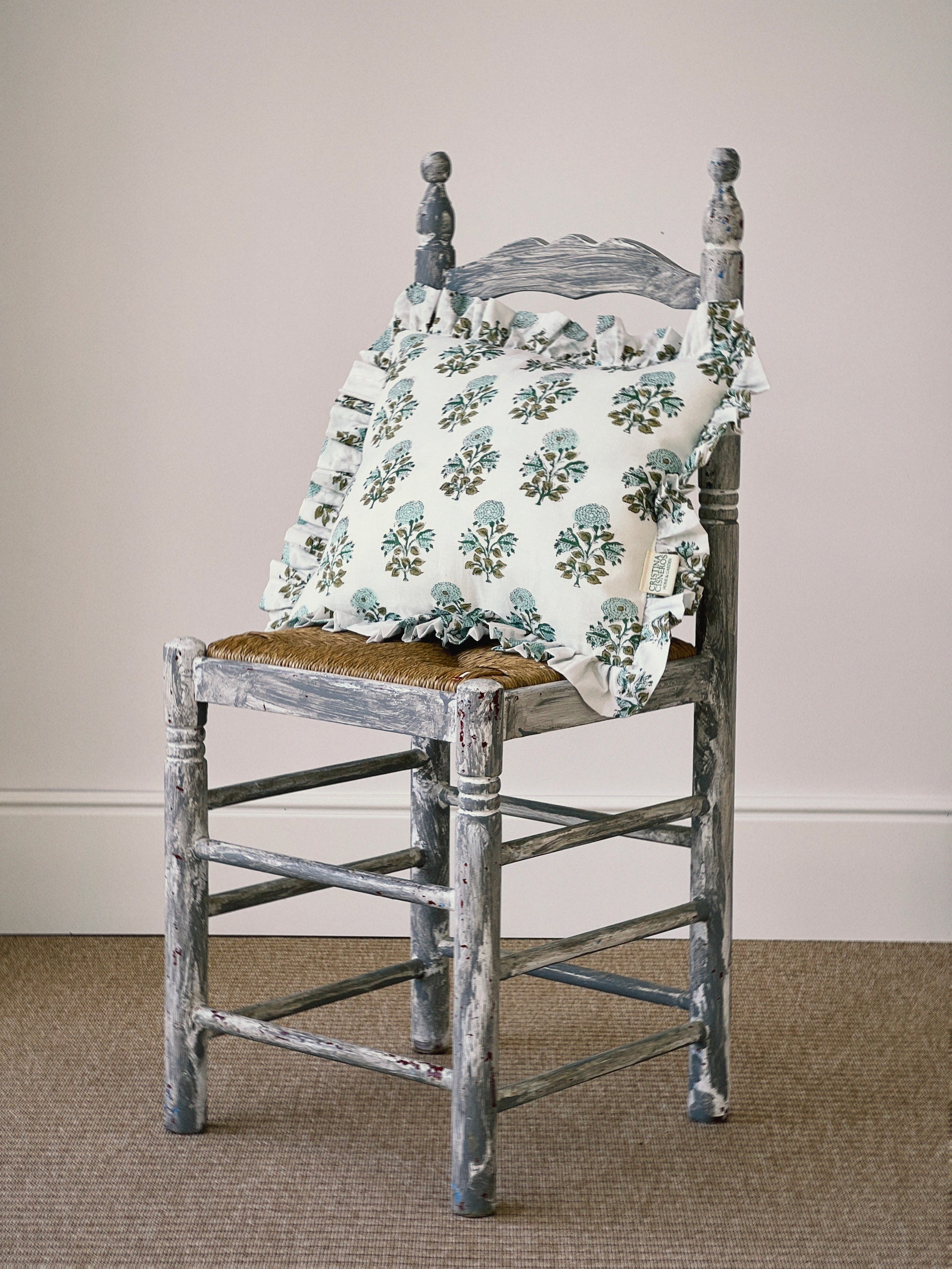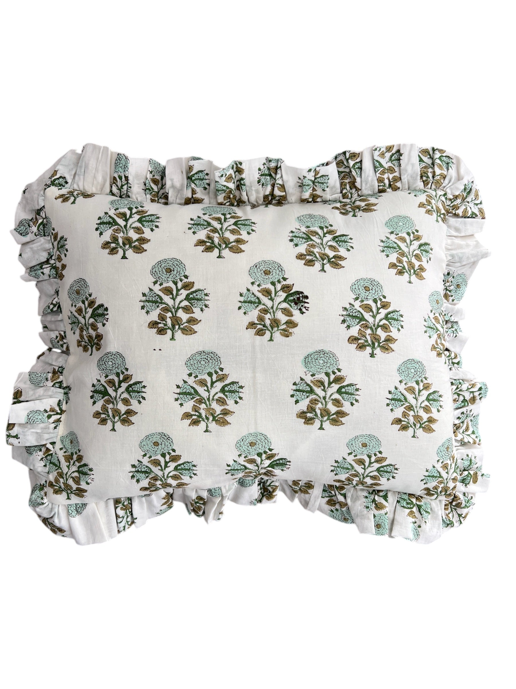 CUSHION RUFFLES BLOCK PRINT FLORAL GREEN WHITE
