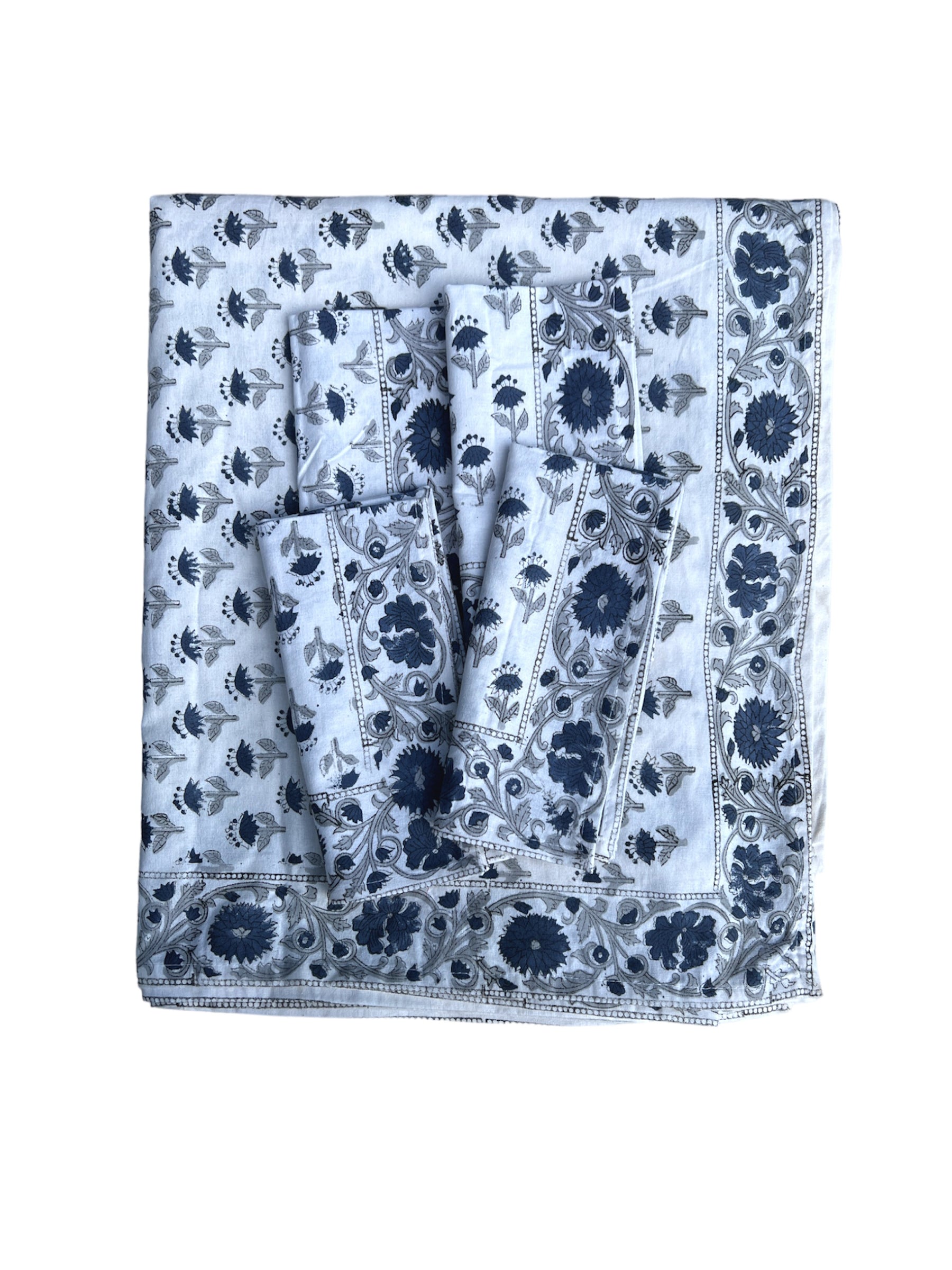 TABLECLOTH AND NAPKINS SET BLOCK PRINT WHITE BLUE