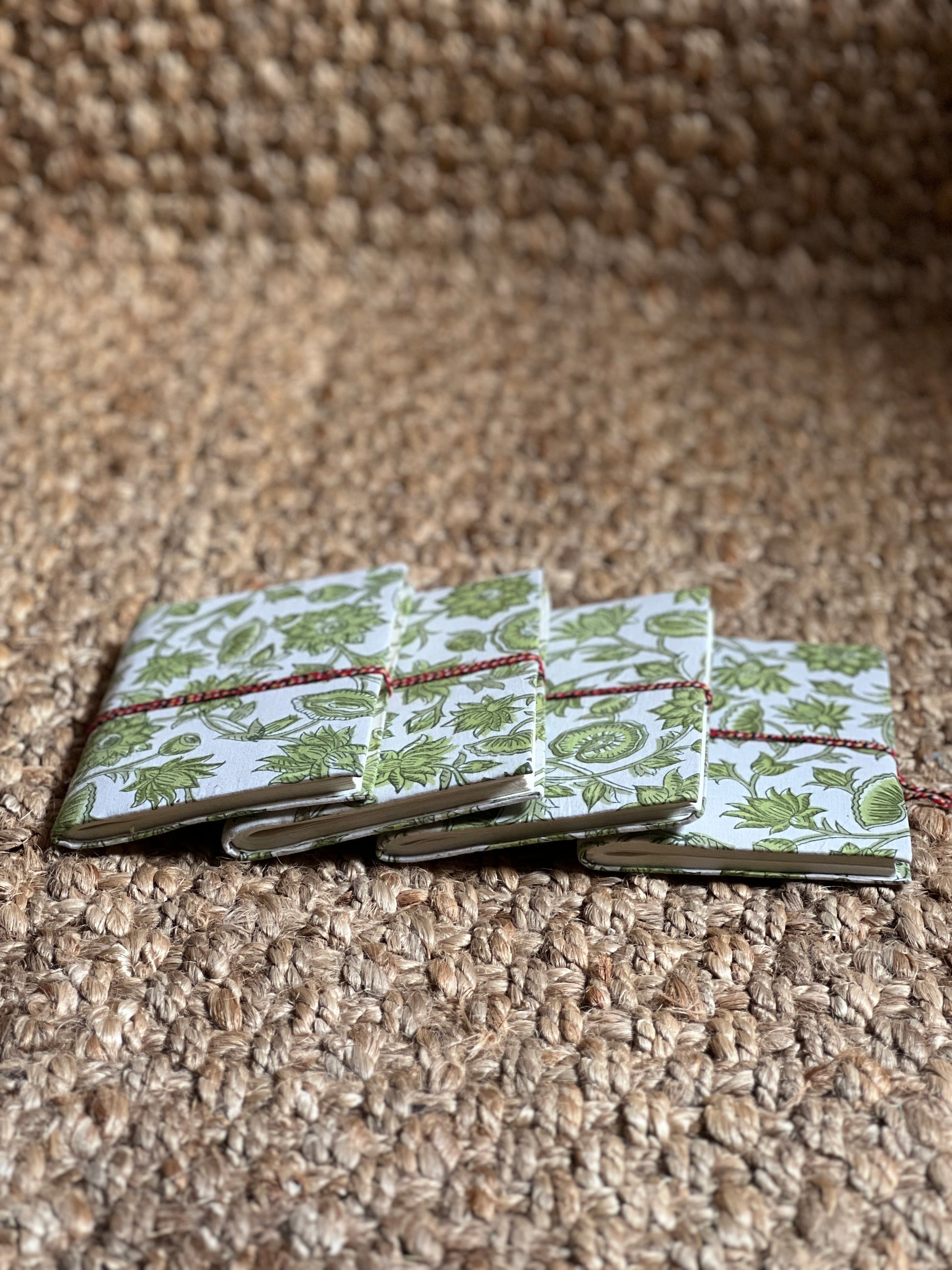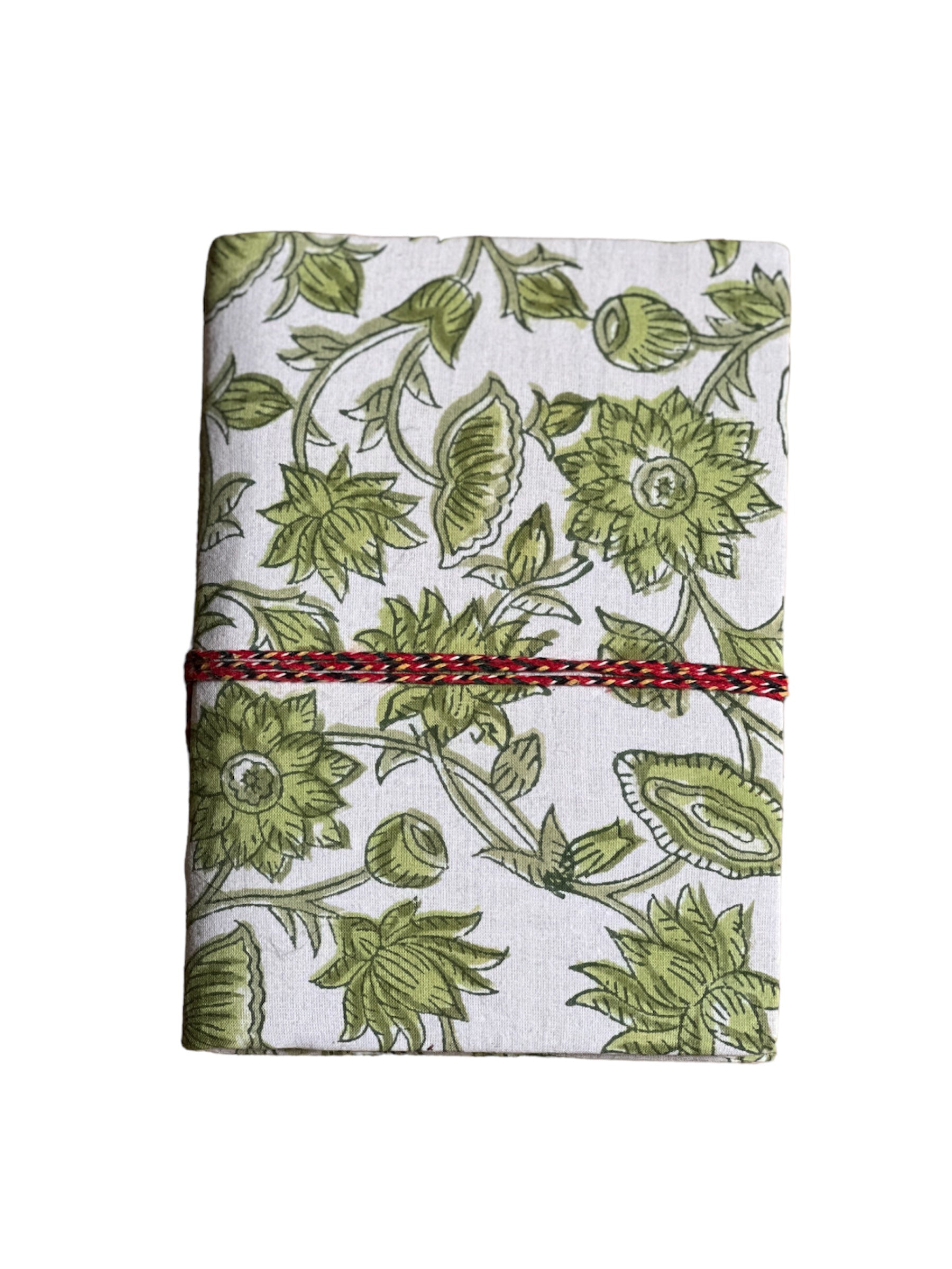 Made of heavy-weight paper for writing and drawing without transfer problems, covered in 100% cotton fabric with hand-made prints, handmade binding and two-turn cord closure.