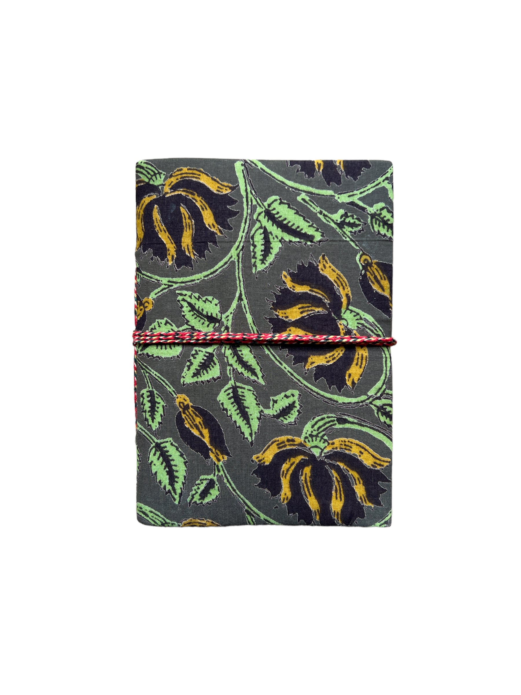 A5 or A6 notebook lined with Block Print fabric and with drawstring closure. It can be used as a travel notebook, personal organization book, for university, drawing notebook, bullet journal and infinite other uses.
