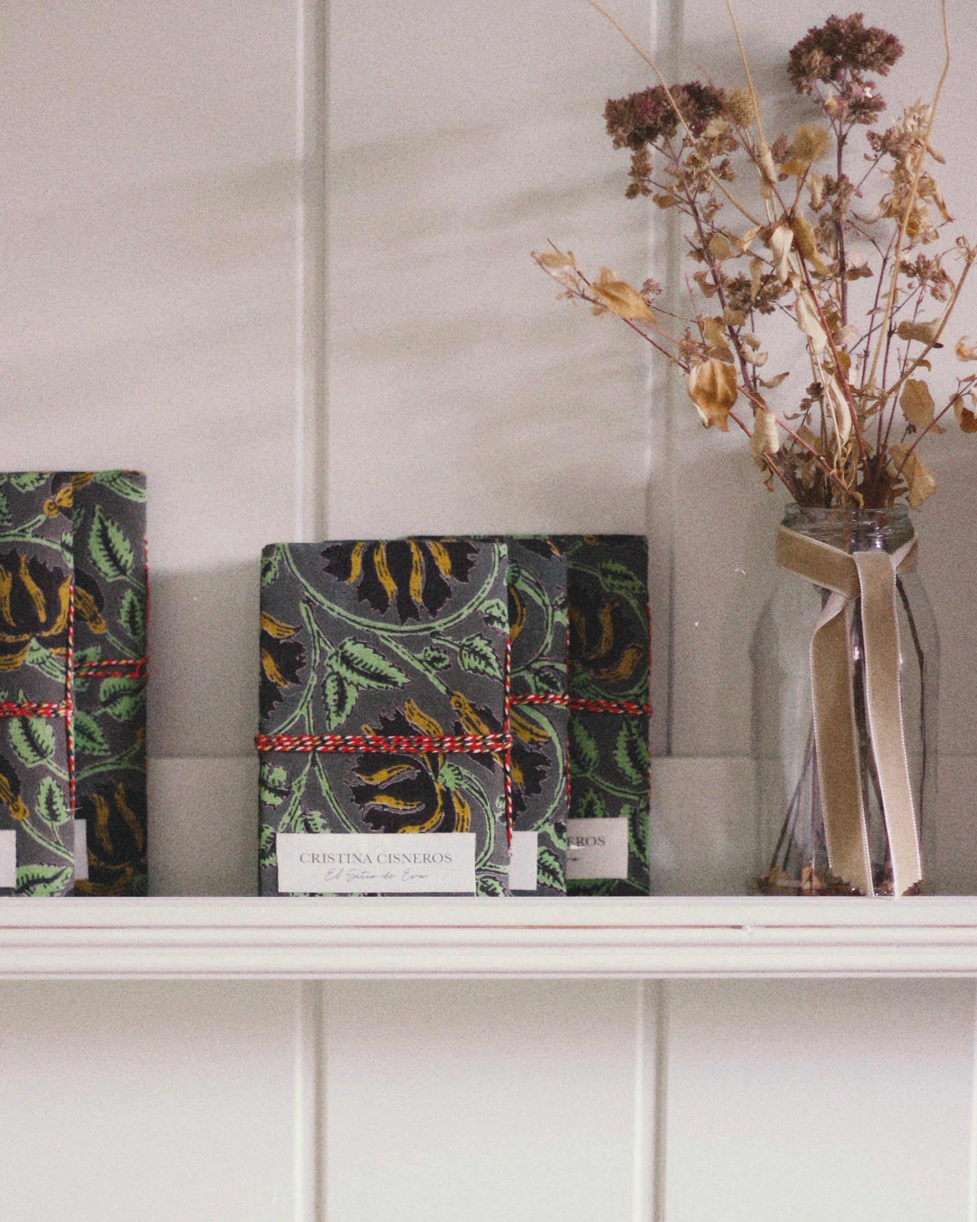 Made of heavyweight paper for writing and drawing without transfer problems, lined with 100% cotton by hand with hand-dyed fabrics and closure with a two-way cord.