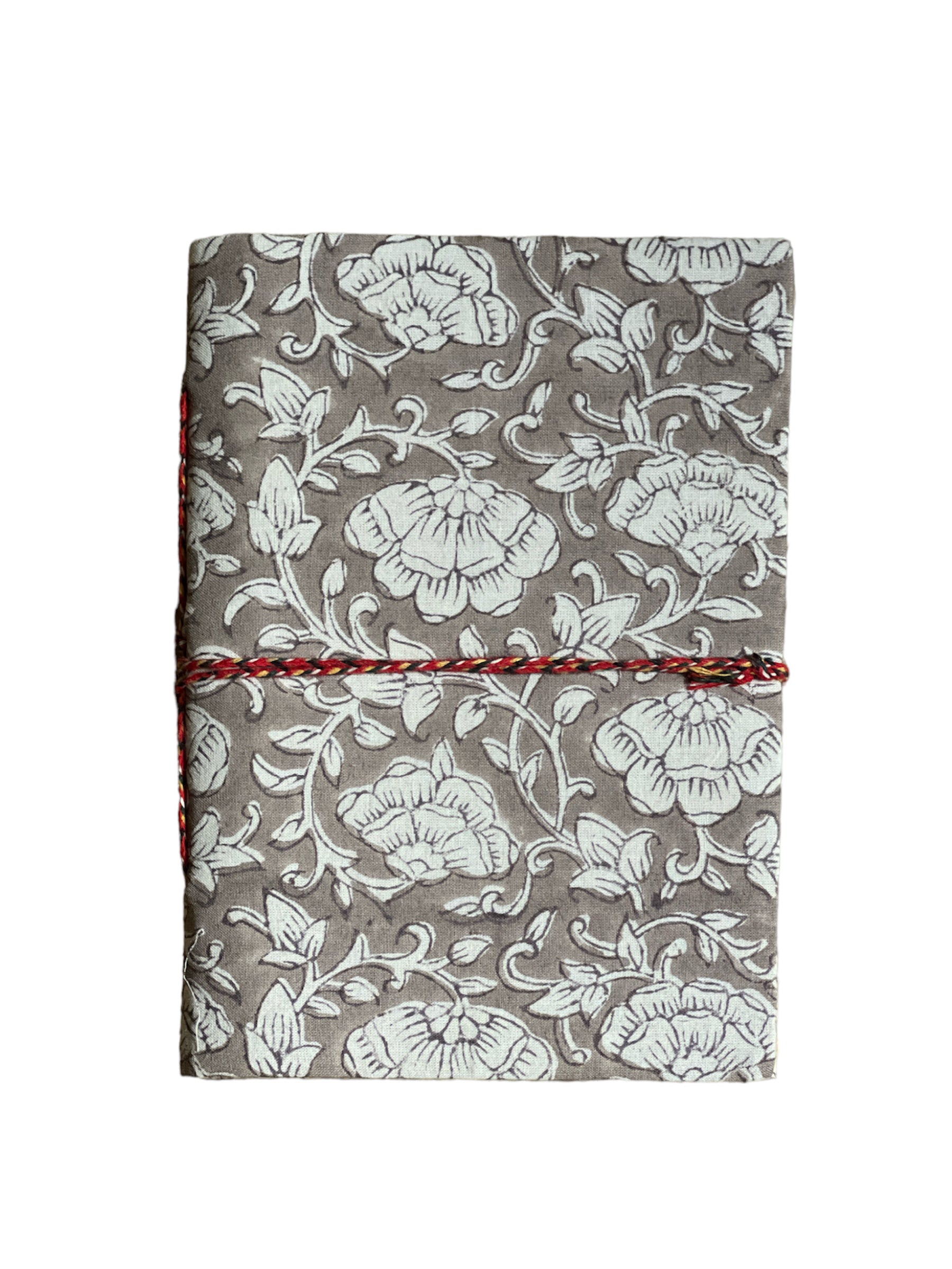 Made of heavy-weight paper for writing and drawing without transfer problems, covered in 100% cotton fabric with hand-made prints, handmade binding and two-turn cord closure.