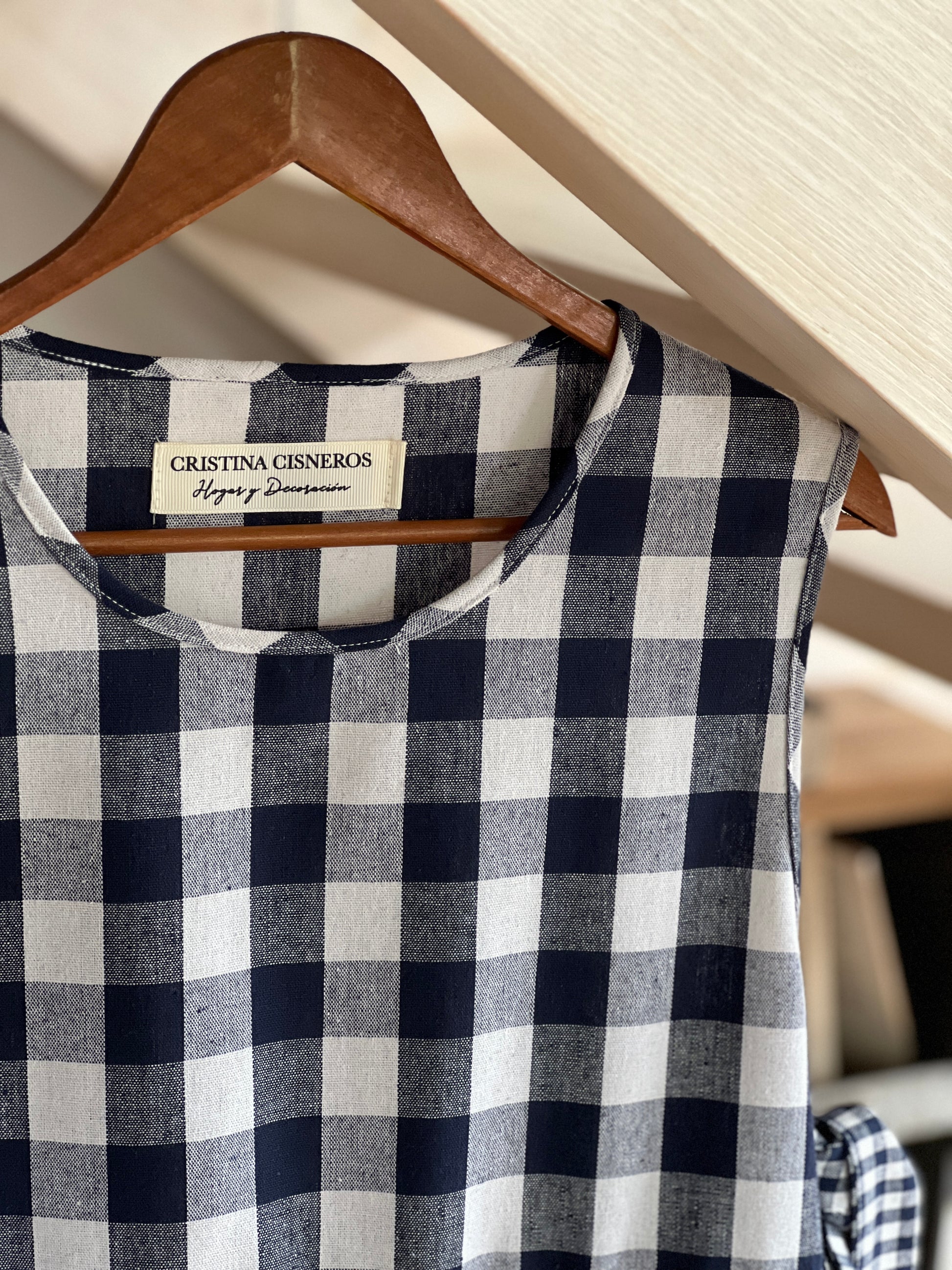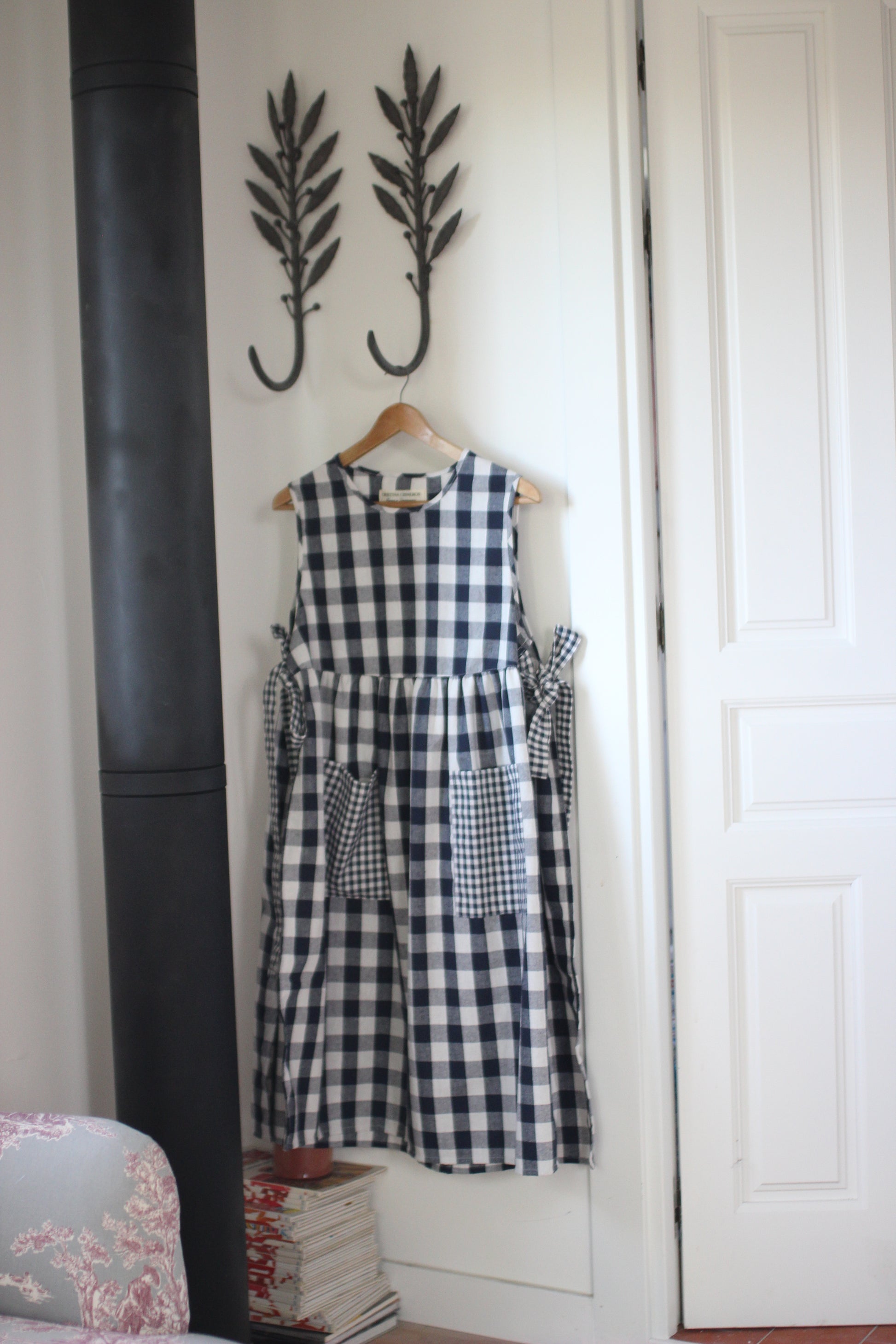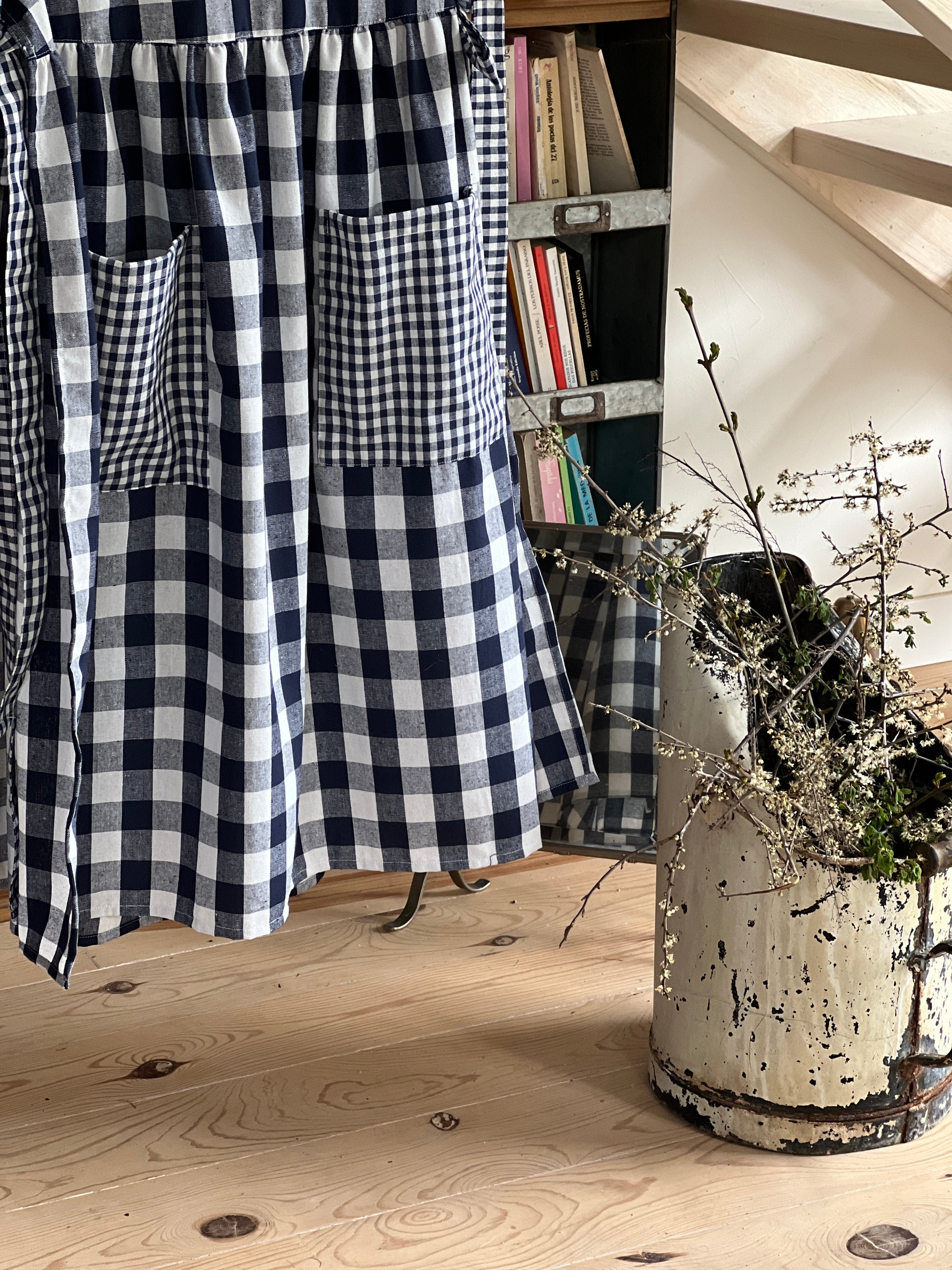 Long Vichy check linen and cotton apron with ties. Available in different colors. Made by hand, with large pockets and adjustable waist with two positions.