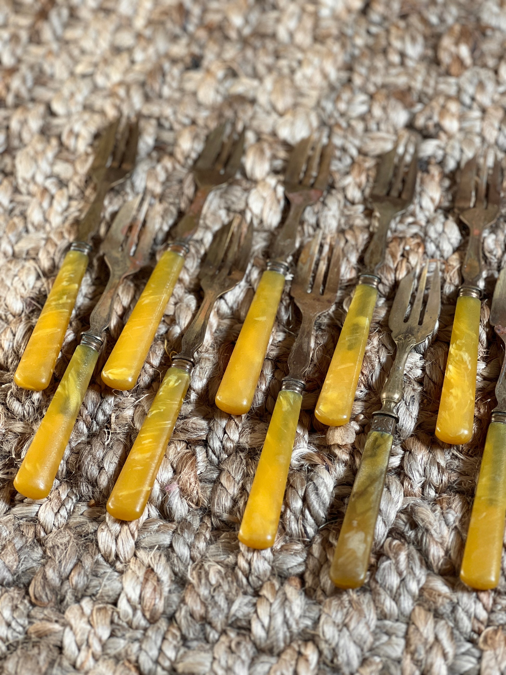 Set of 12 antique dessert forks , they will give the perfect touch of color that stands out on your tables. Decorated with small filigrees .