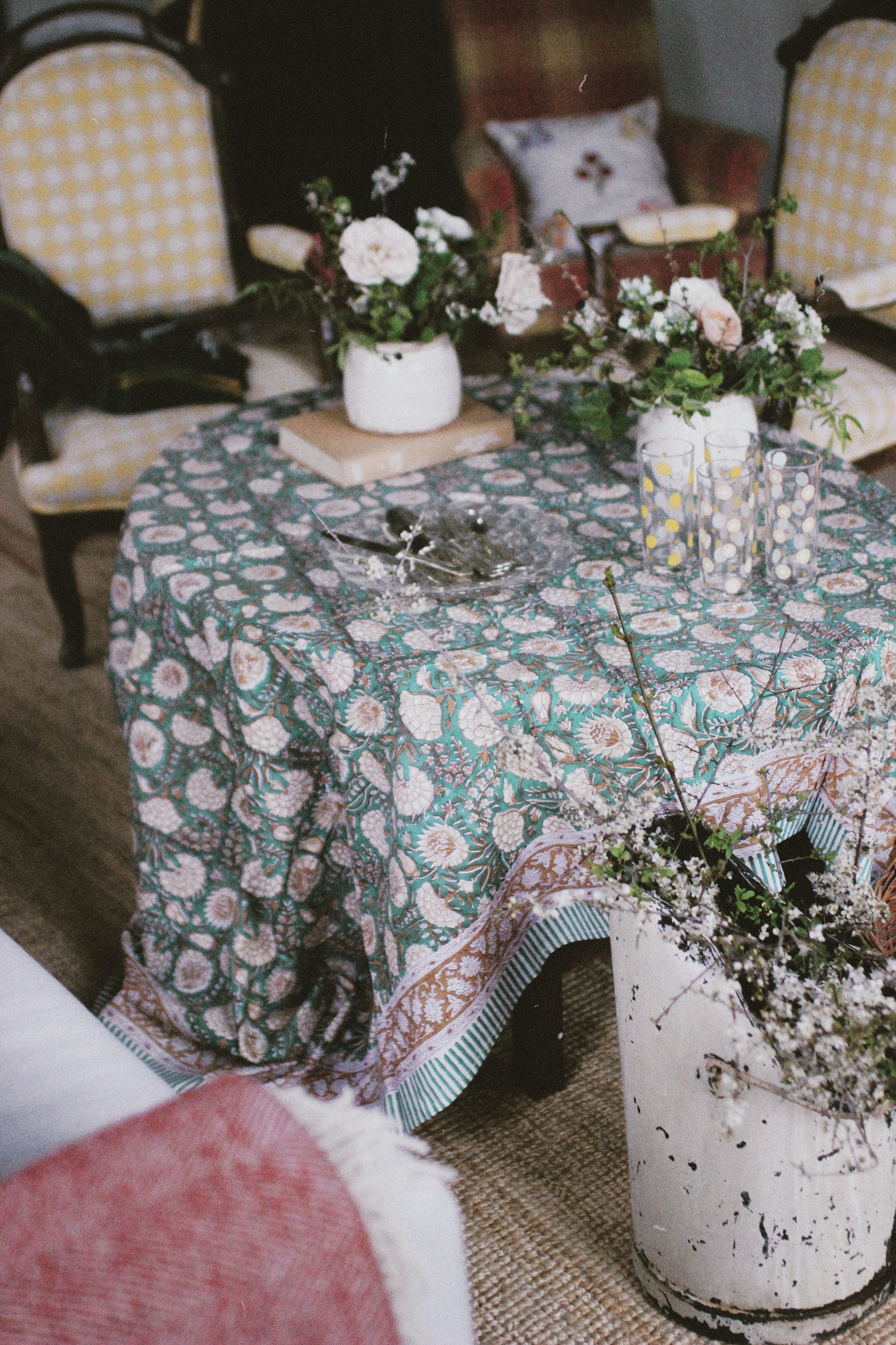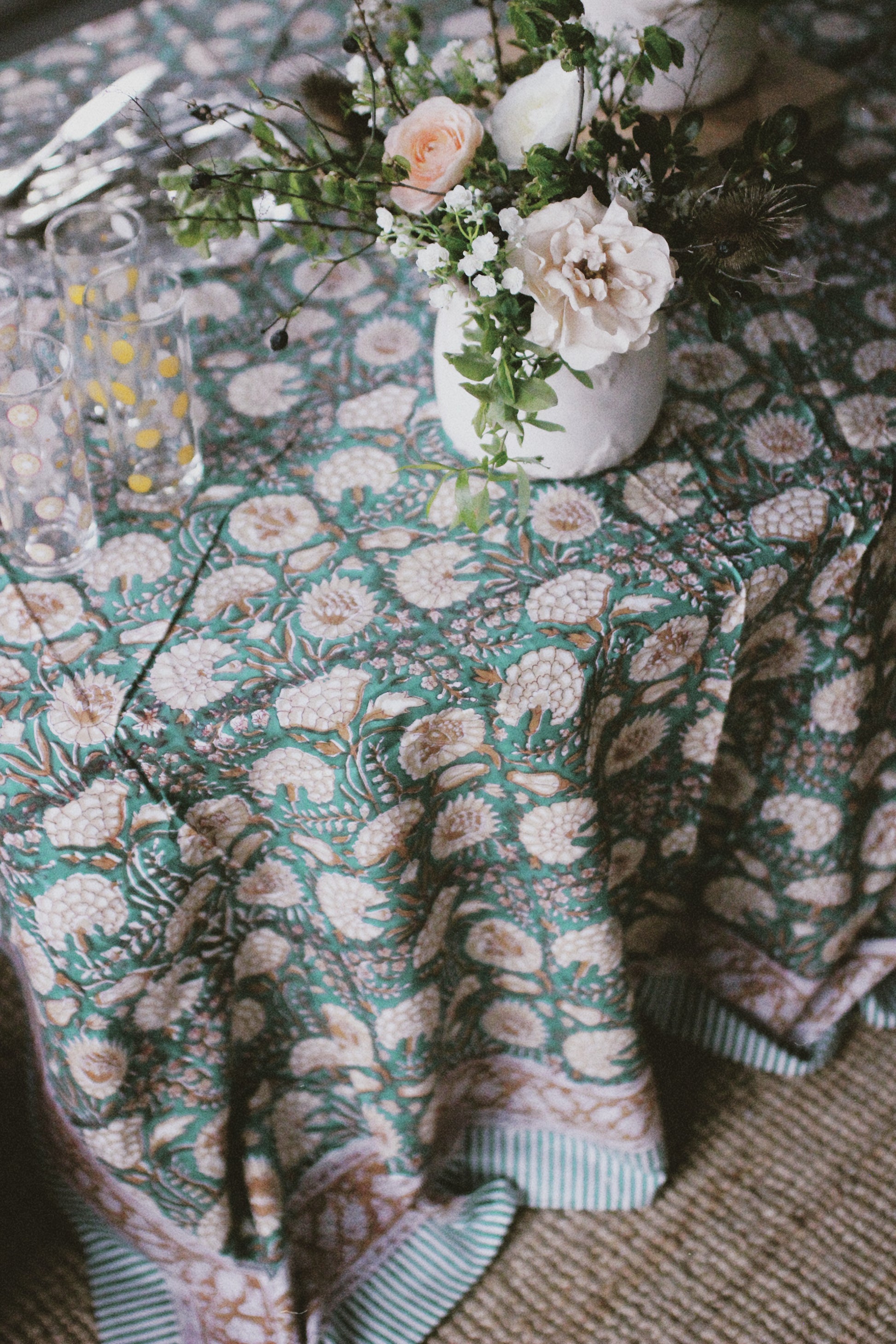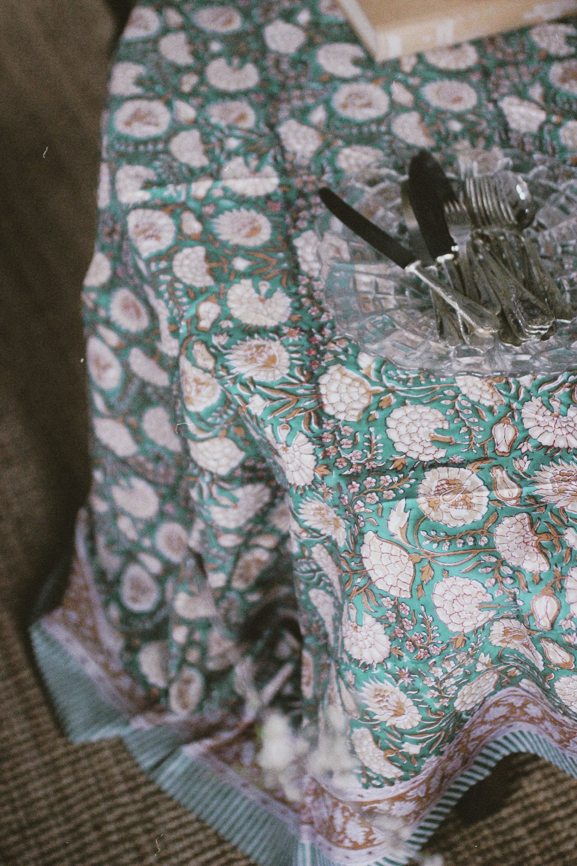FLORAL TABLECLOTH BLOCK PRINT TURQUOISE GREEN