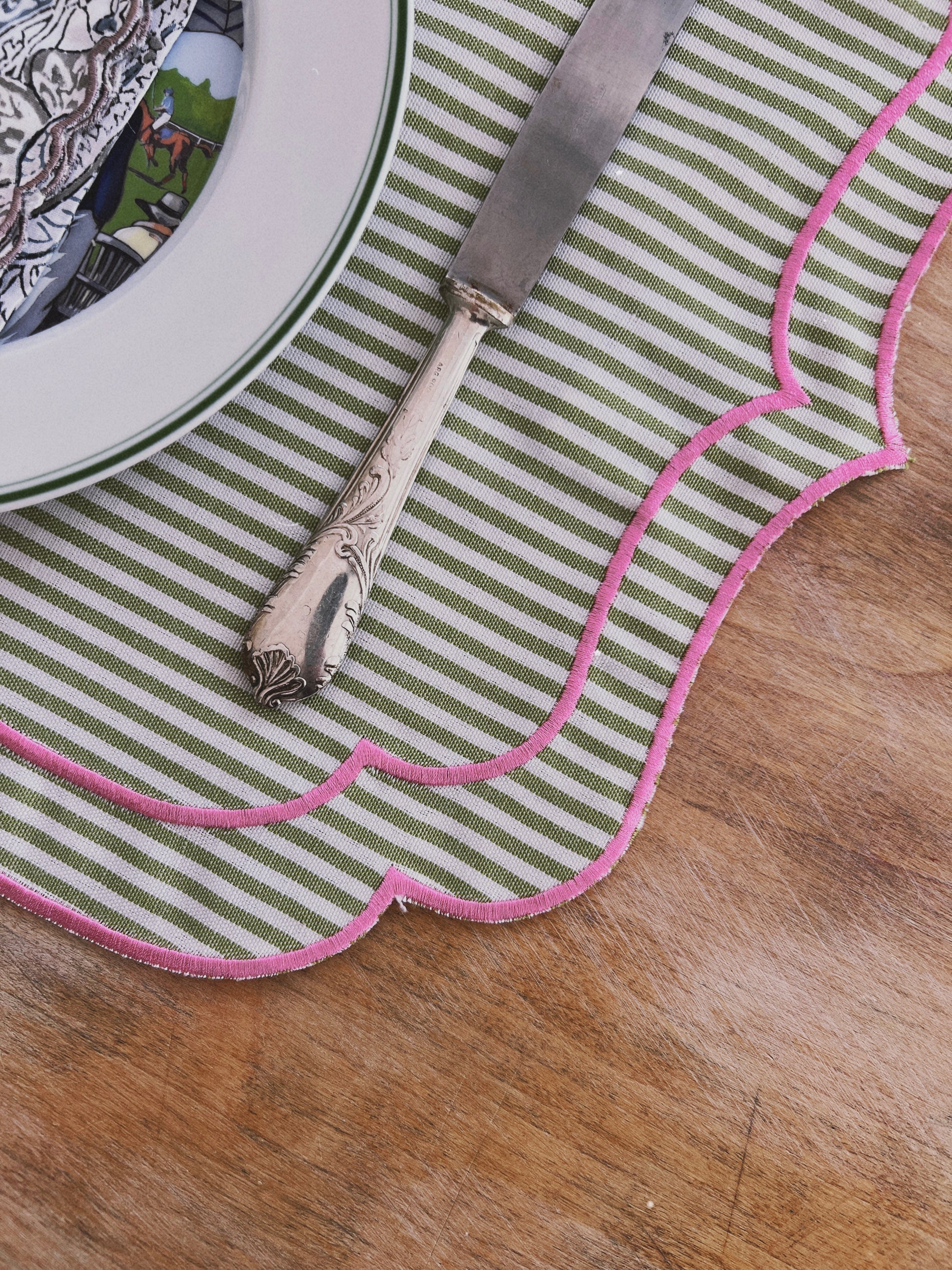 SET OF 2 STRIPED PLACEMATS WITH SCALLOP, PINK GREEN