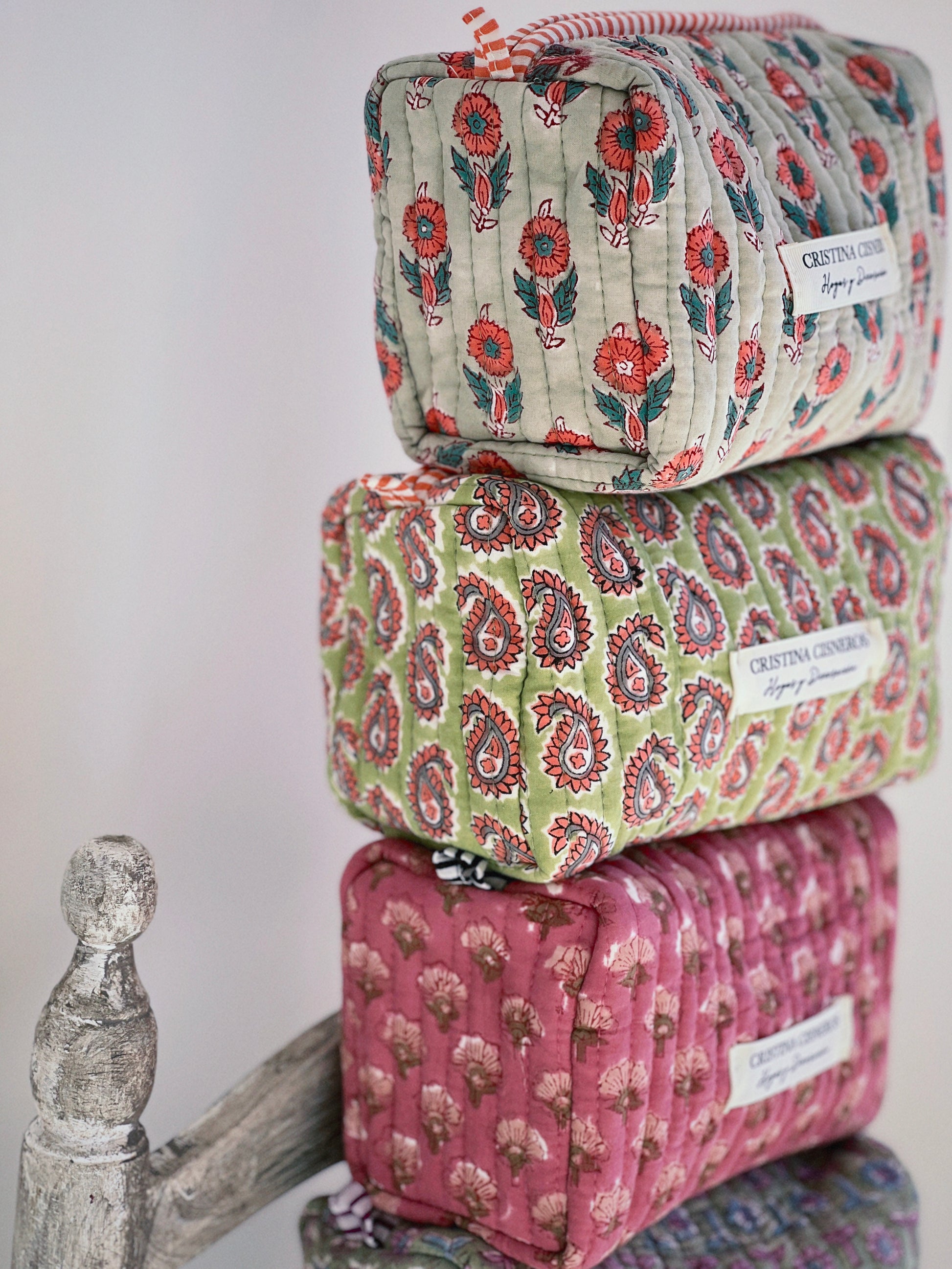 Padded Block Print Toiletry Bag, ideal for carrying small items and keeping everything handy and organized. Bathroom products, makeup bag, travel jewelry case, underwear bag, etc. Waterproof interior lining with two pockets.