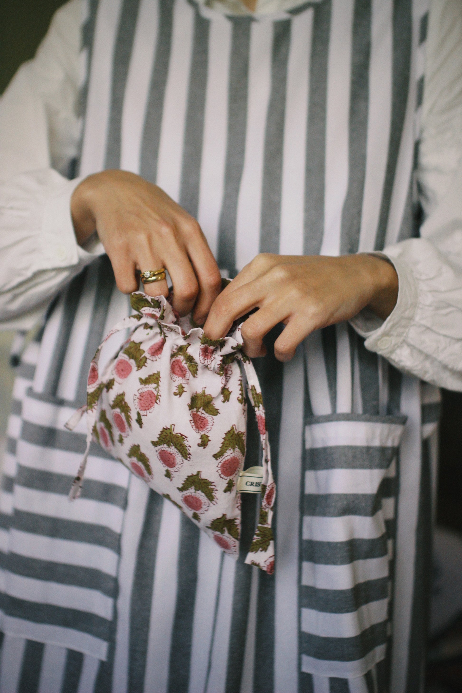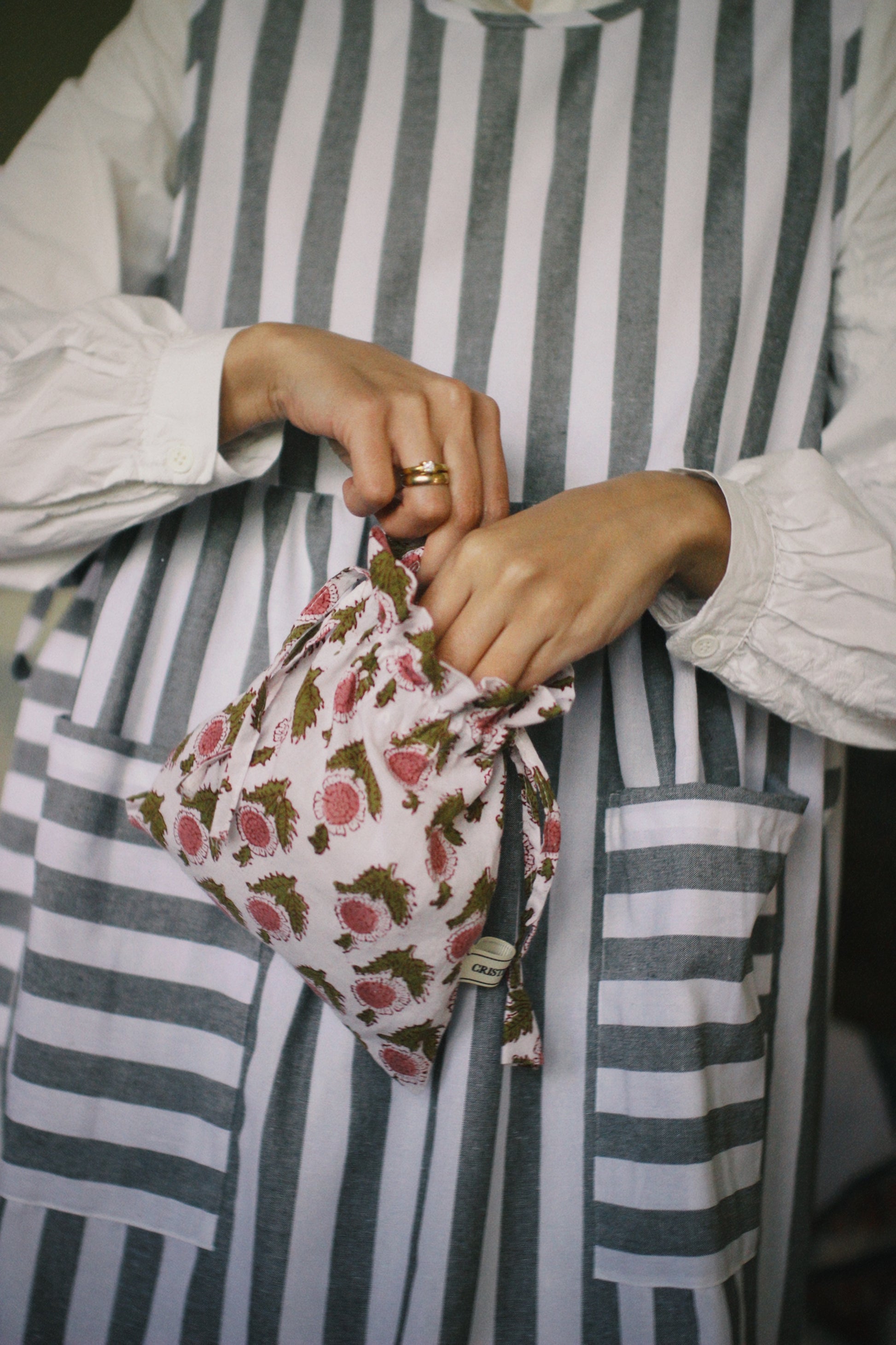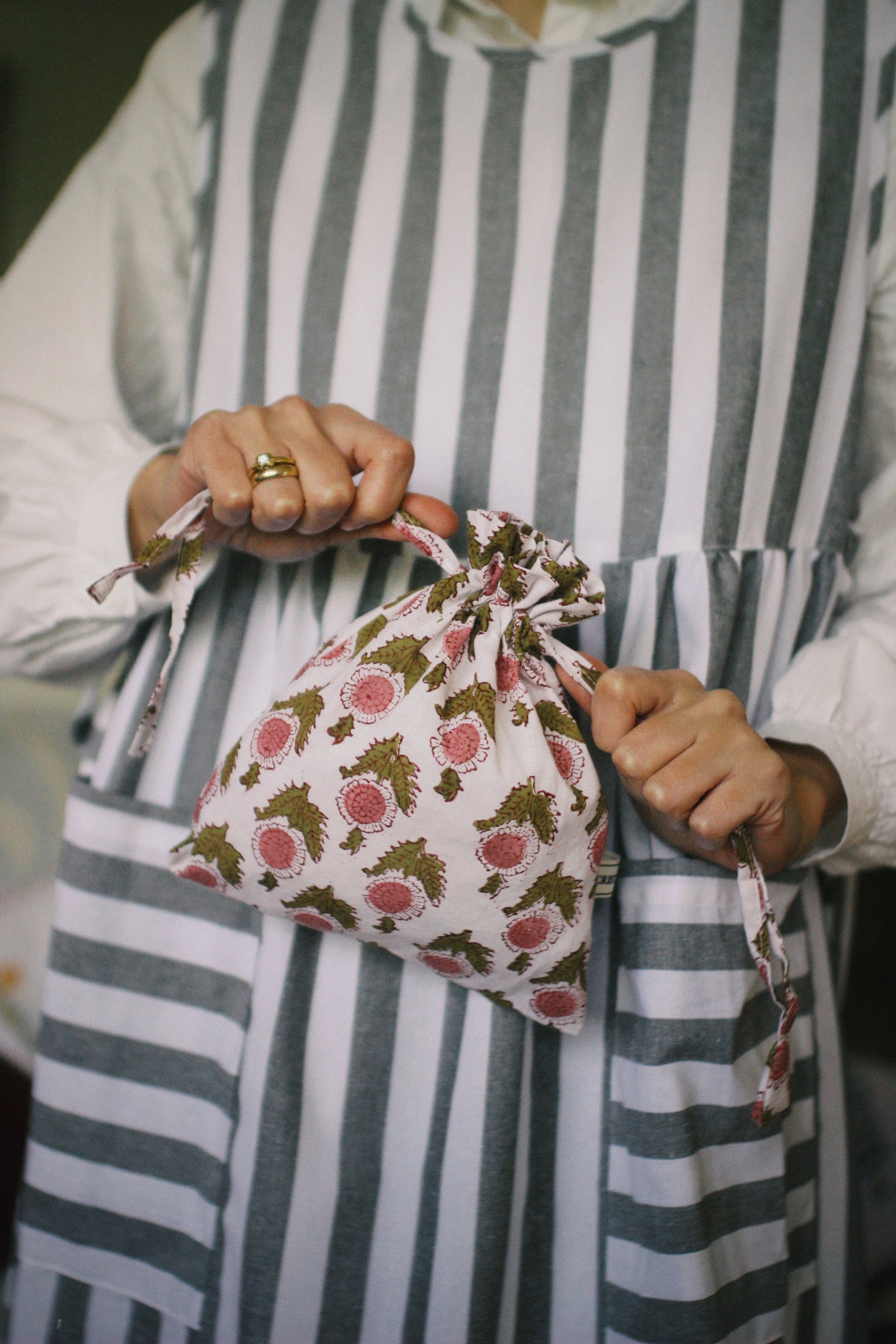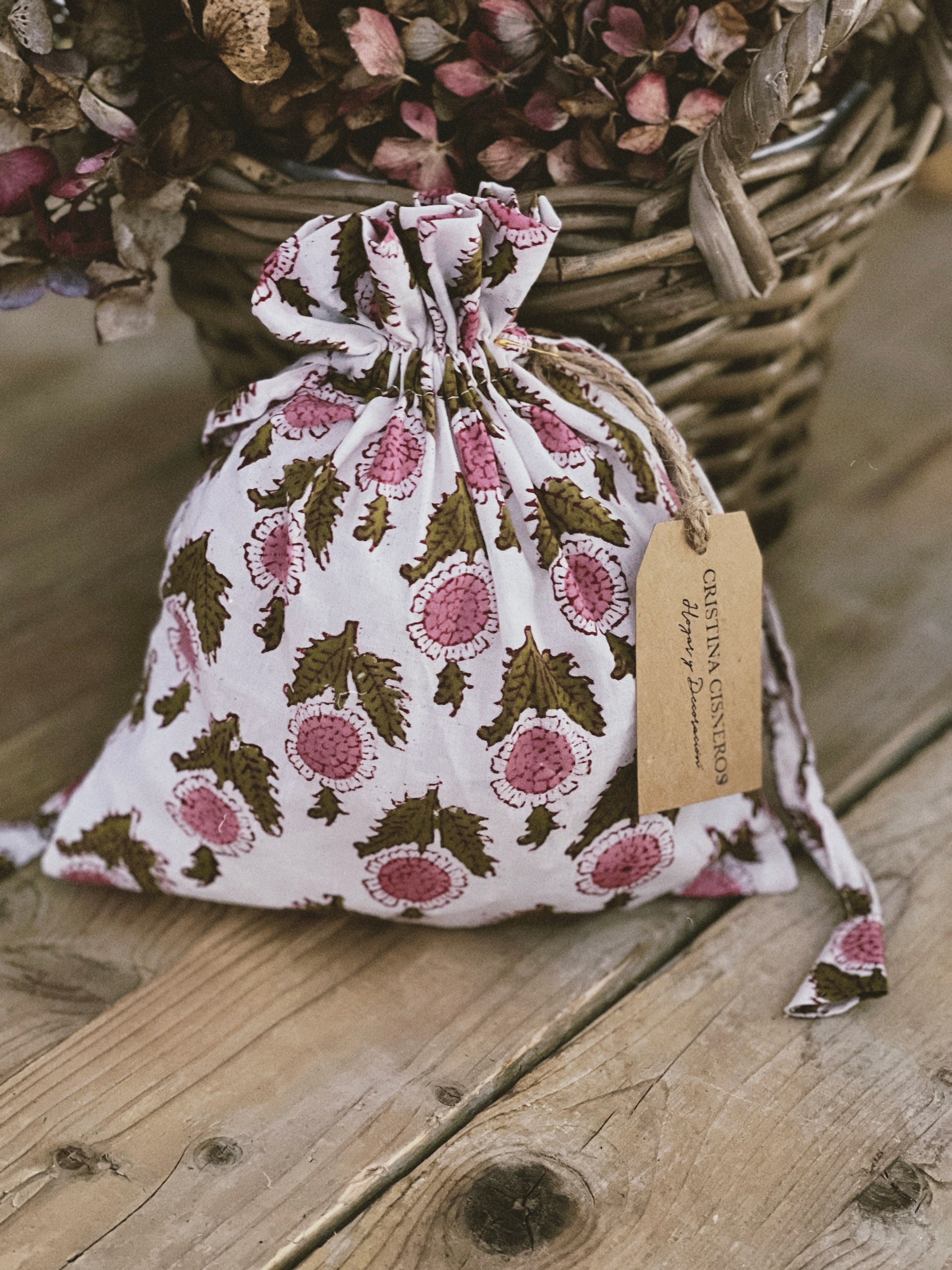 Small Block Print bag, bag, bag , ideal for transporting small objects and having everything at hand and well organized. As a toiletry bag, underwear, bag organizer , travel, or even as a handbag for a special occasion. Drawstring closure.
