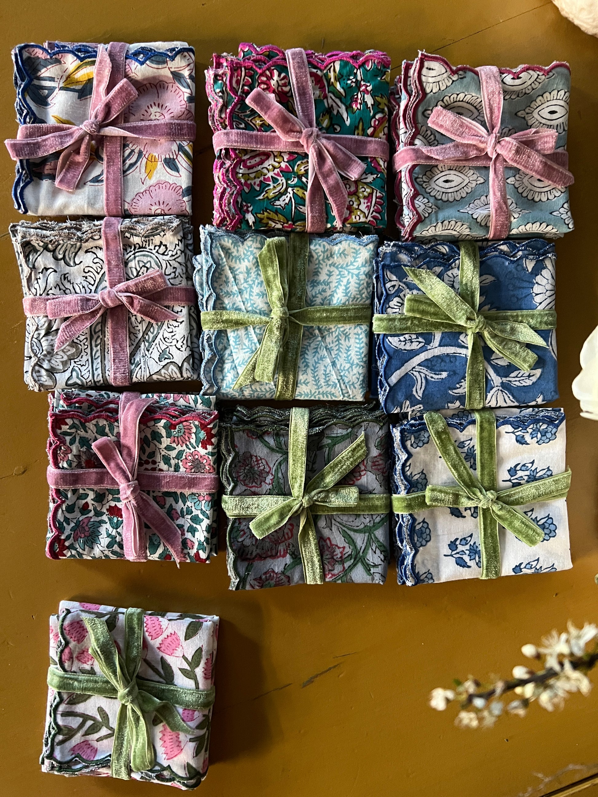 Set of 2 napkins measuring 40×40 cotton block print with a coloured scallop. Available in different models. 100% handmade floral cotton, with hand-printed fabrics .