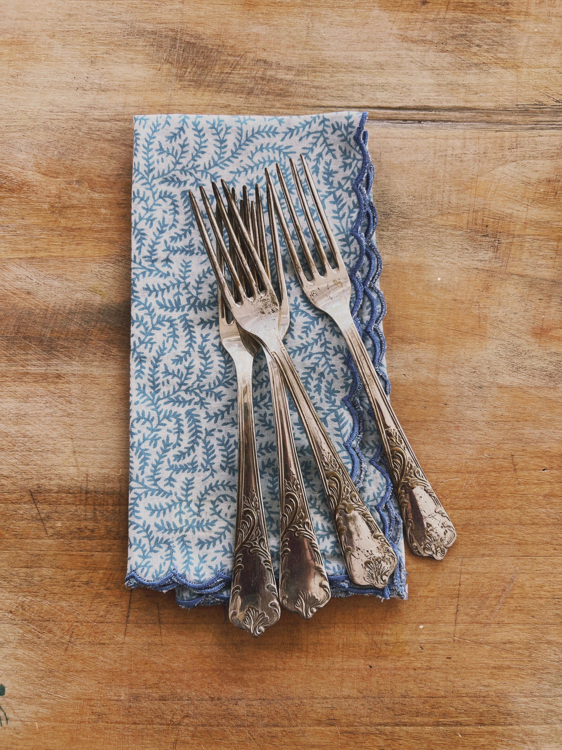 SET OF 2 COTTON BLOCK PRINT NAPKINS WITH LIGHT BLUE WHITE WAVE SCALLOP