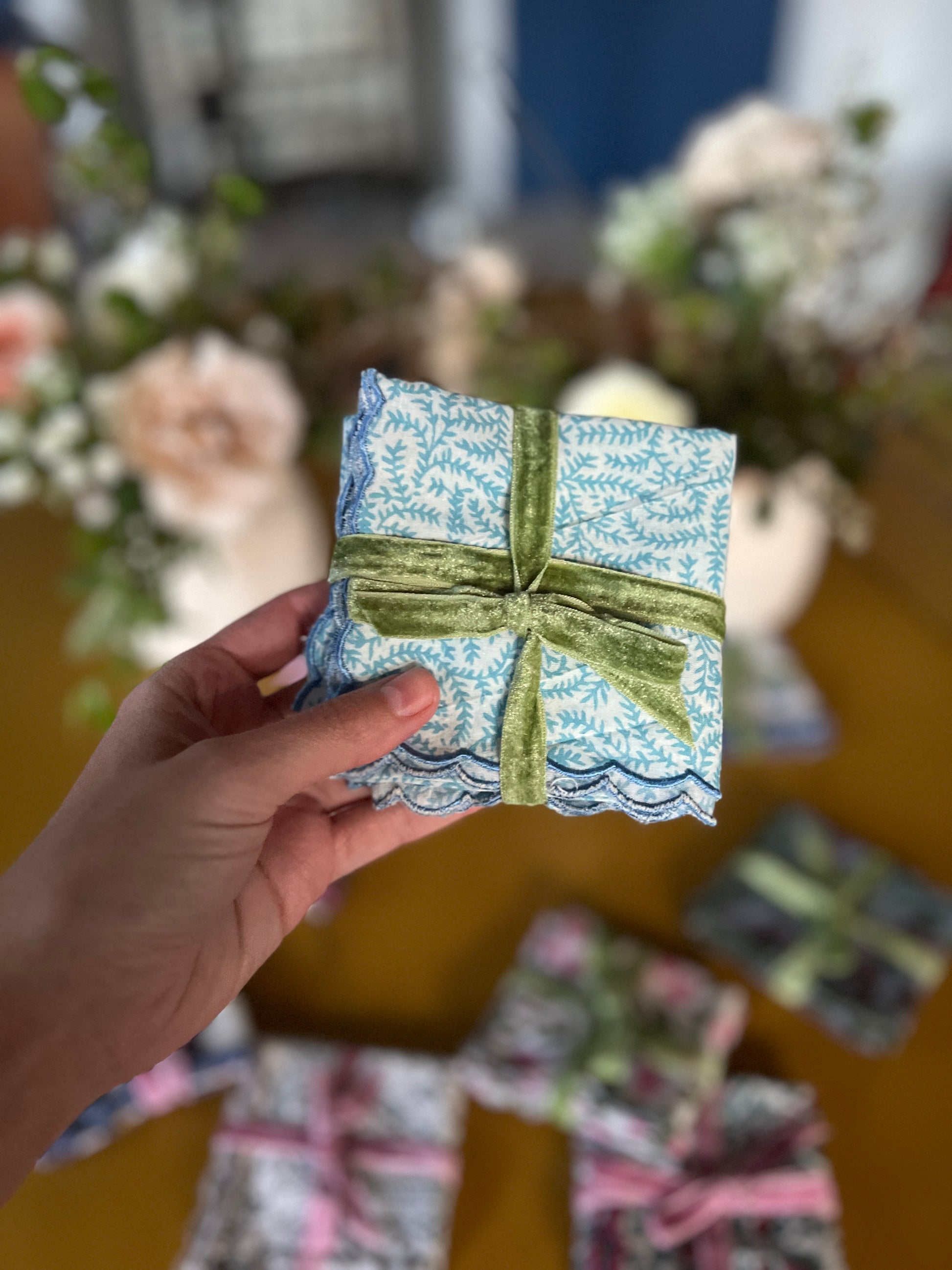 Set of 2 napkins measuring 40×40 cotton block print with a coloured scallop. Available in different models. 100% handmade floral cotton, with hand-printed fabrics .