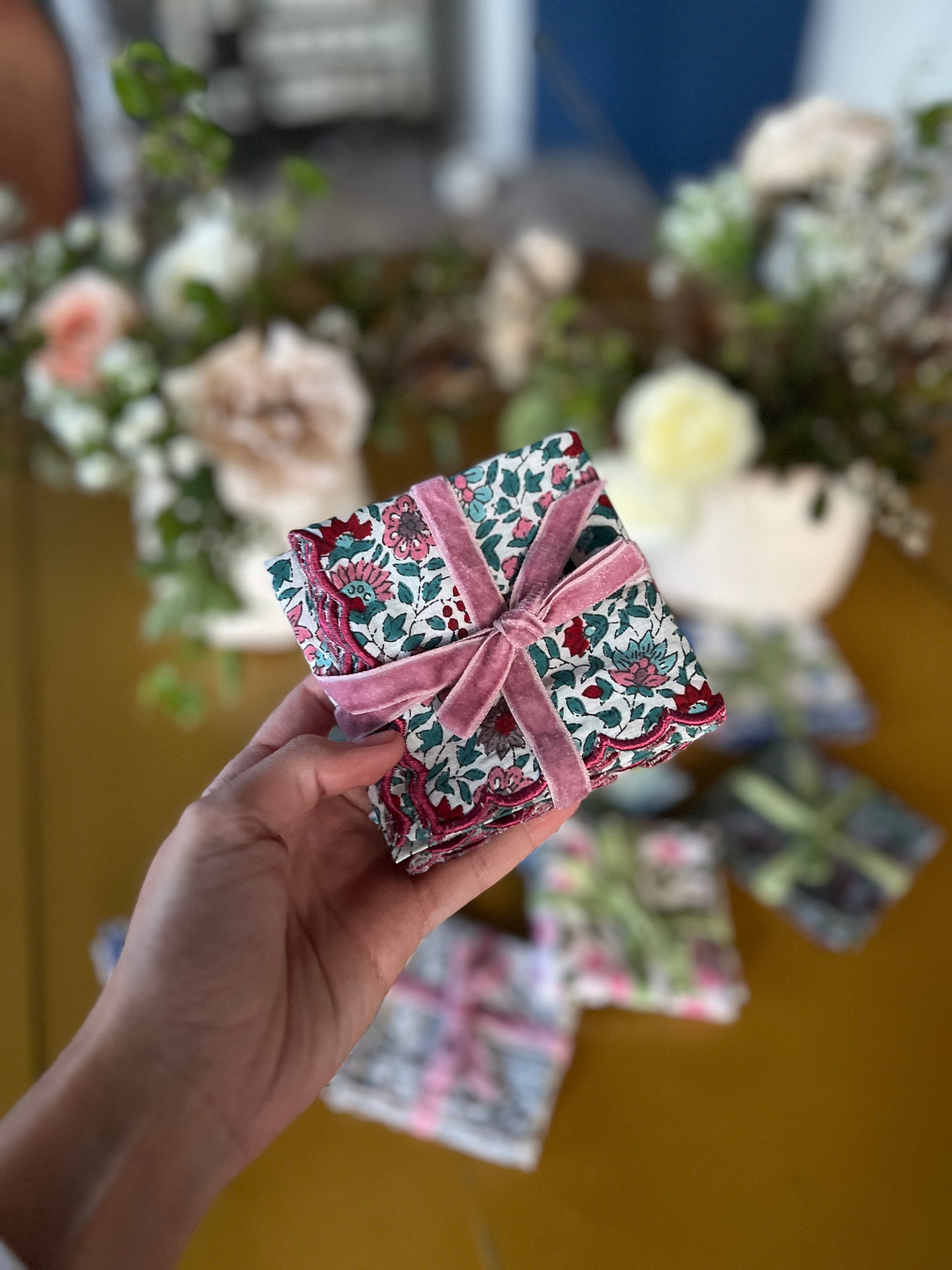 Set of 2 napkins measuring 40×40 cotton block print with a coloured scallop. Available in different models. 100% handmade floral cotton, with hand-printed fabrics .