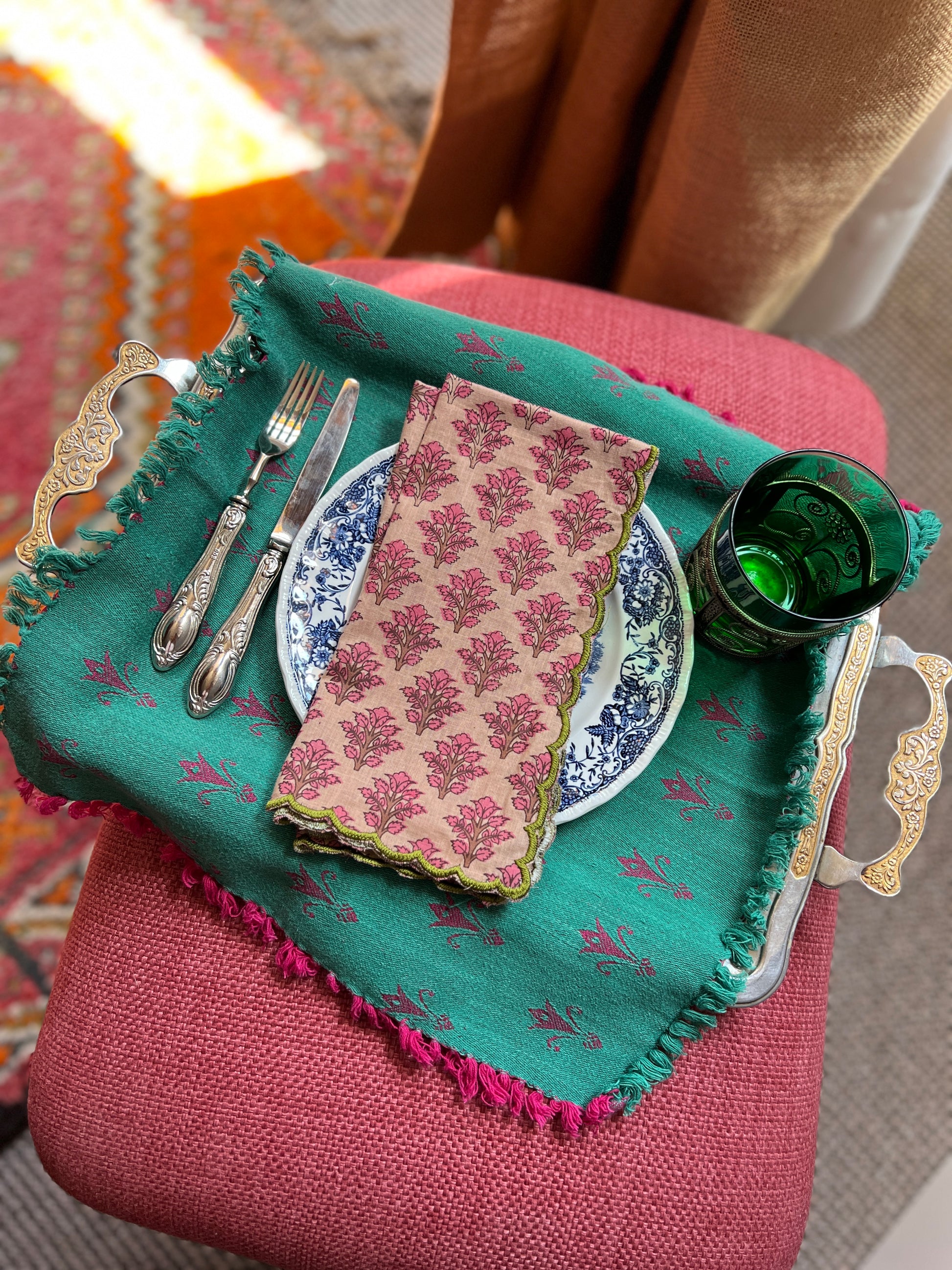 SET OF 2 BLOCK PRINT COTTON NAPKINS WITH SALMON WAVE FESTON