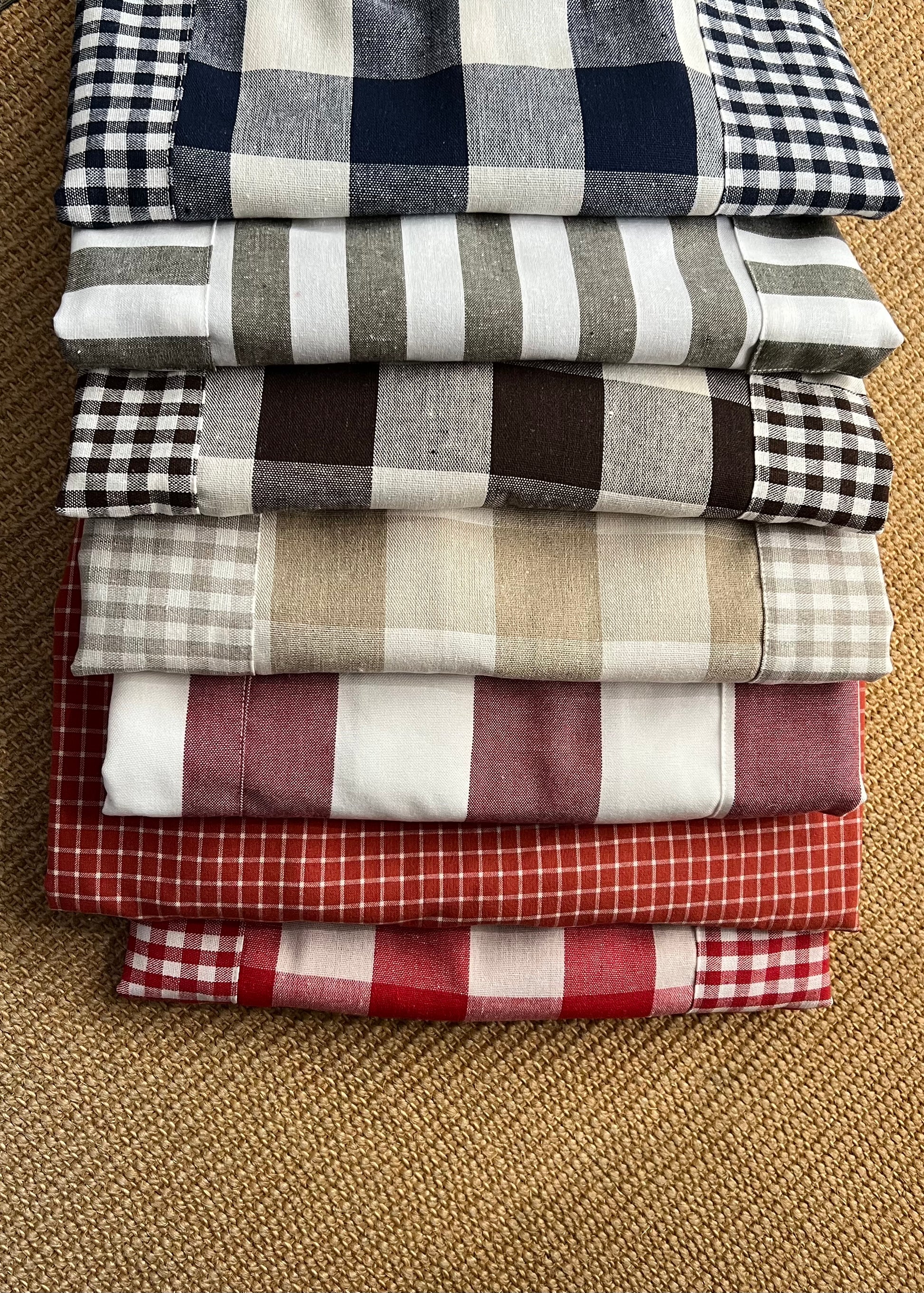 Delantal largo de lino y algodón a cuadros Vichy con lazadas. Disponibles en diferentes colores. Confeccionado a mano, con amplios bolsillos y ajustable en cintura con dos posiciones.